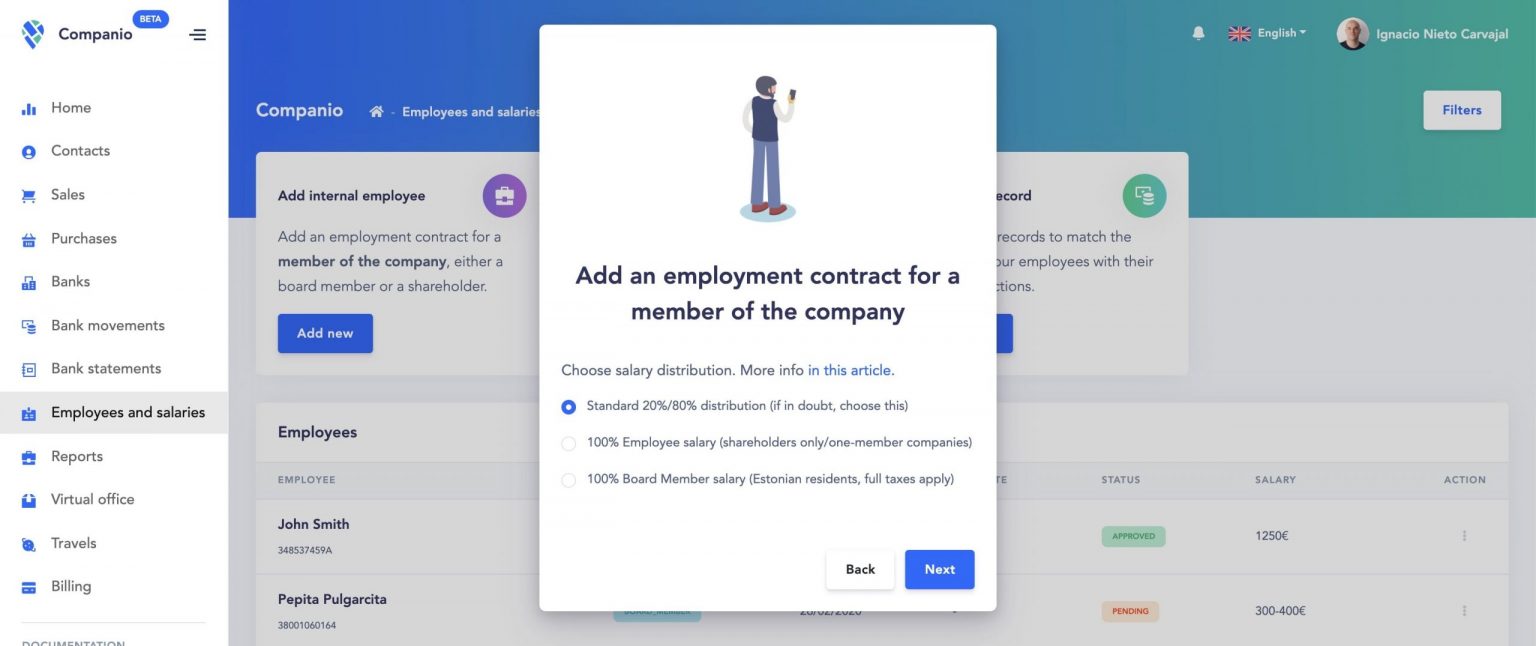 A unique aspect of Companio is the management of the employees of the company, both internal employees (board members, directors, etc.) and external employees. With Companio, you can automatically generate employment records and even contracts for your employees. Simply enter the employee details, the job description, salary, and bank details of the employee, and let Companio do the rest.
