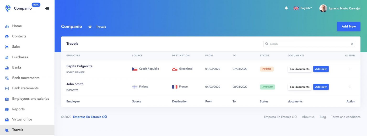 Companio incorporates the management of business trips for members of the board and employees. This aspect is of vital importance for companies founded by e-residents because their activities usually involve traveling and international operations.