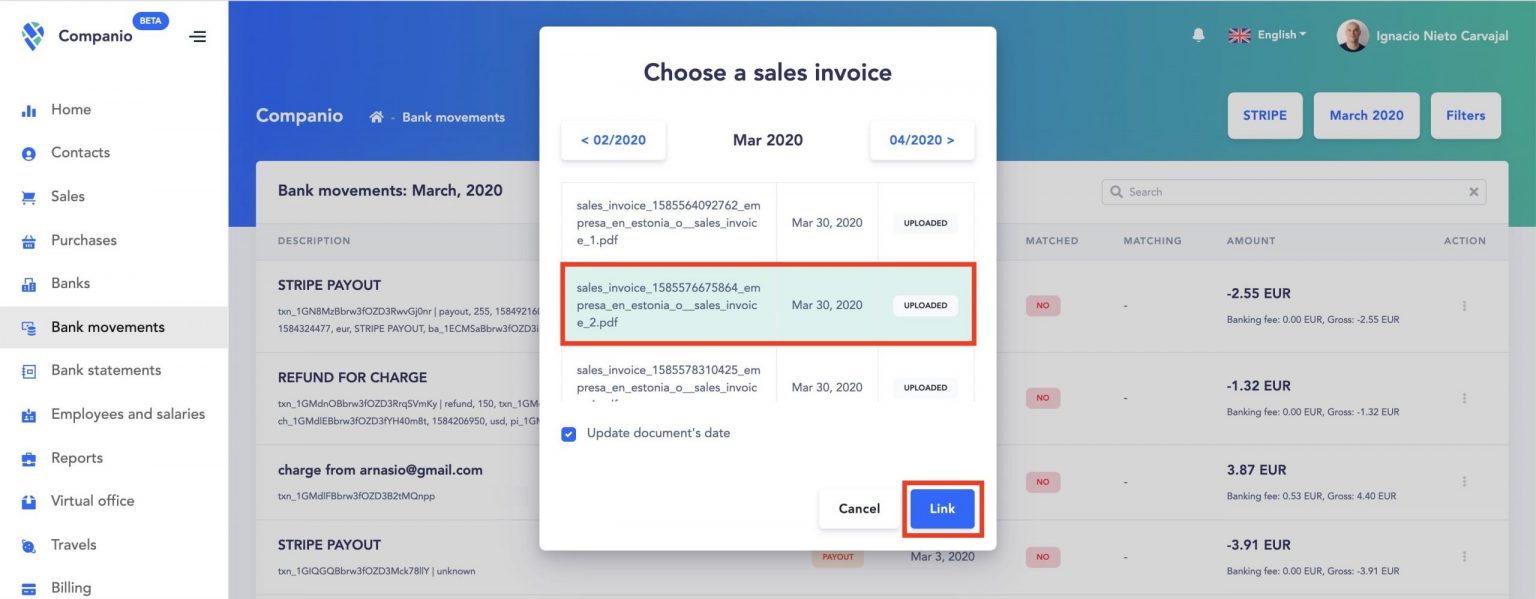 Companio incorporates not only the management of sales and purchase invoices but also bank statements. When possible, bank statements are analyzed and processed to extract the details of the bank movements of that period, to display them as if the account had been automatically linked. This allows –in some cases– to match bank movements with invoices, travel expenses, salaries, etc, even if we can’t access your bank automatically.