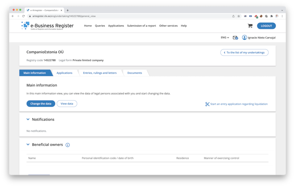 Once inside, go to Applications > Dashboard > My Undertakings. You will see a list of your companies. Most probably, there will only be one. Click on the name of your company.