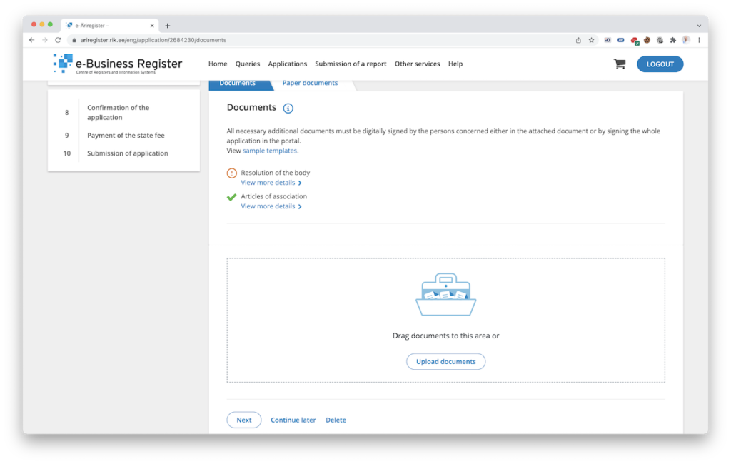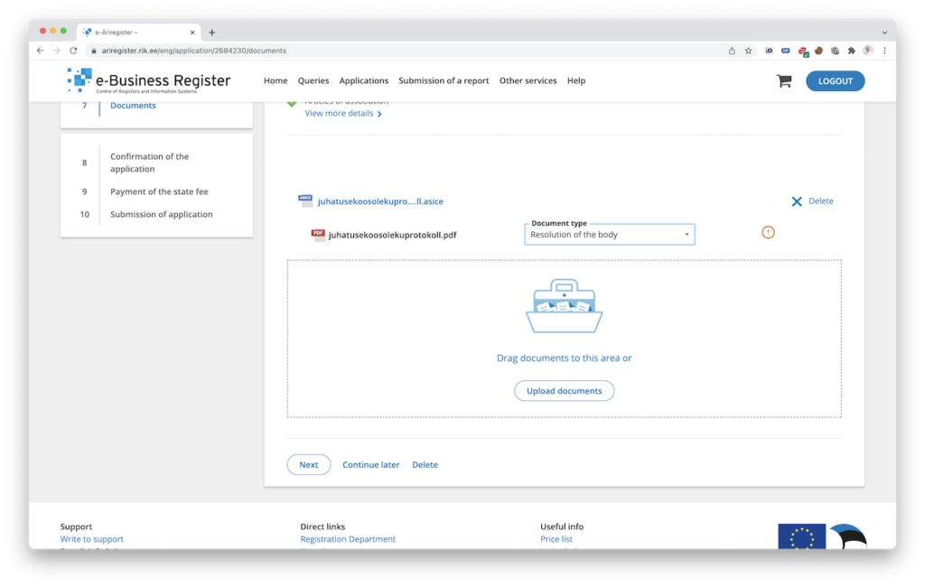 You will see a message asking you to upload the resolution of the body. This is the juhatusekoosolekuprotokoll document you signed before. It is important that you upload the .asice document (signed by DigiDoc) and not a PDF document. It needs to be digitally signed to be approved.