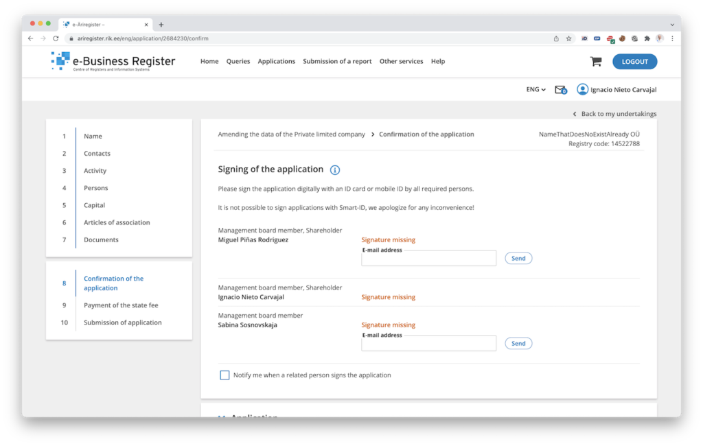 Next, all members of the company need to sign the petition. Go to Section 8, “Confirmation of the application”. You will see the list of members who need to sign. You can easily send them invitations to sign the request via email. To sign yourself, scroll down and click on the “Sign” button. Make sure you have inserted the ID card correctly and get your PIN2 ready to sign.