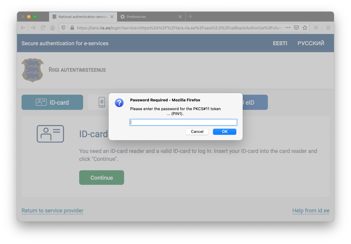 ➡️Click on the button on the left that says “ID-card” (ID Card, or electronic card) and then press Continue. If the card reader works, a dialog will appear asking you to select the certificate. Most probably there will only be one to choose from, so that is the one that you have to select.