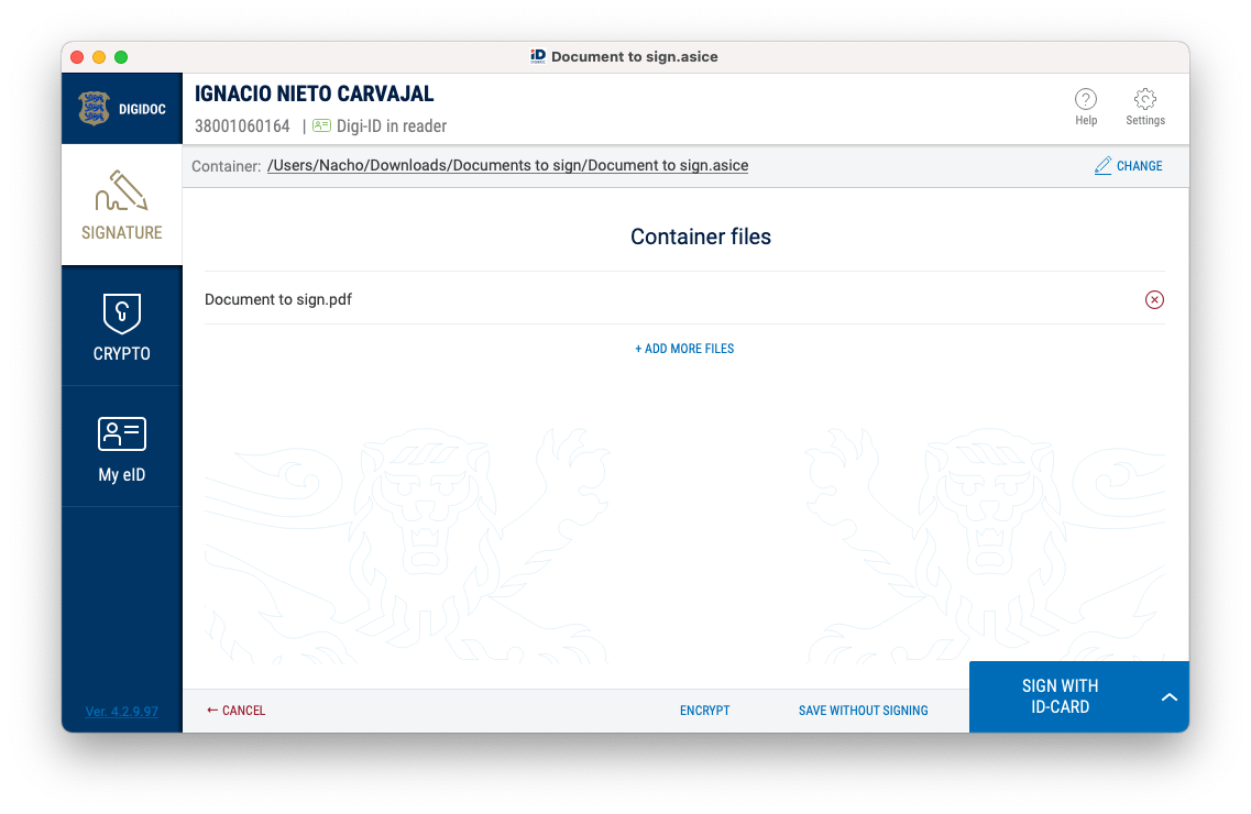 First, connect your e-Residency card to your computer and make sure you have installed the necessary drivers and plugins. If you haven’t already, download also DigiDoc from the official sources. When you are ready, open DigiDoc. Keep the document you want to sign handy.