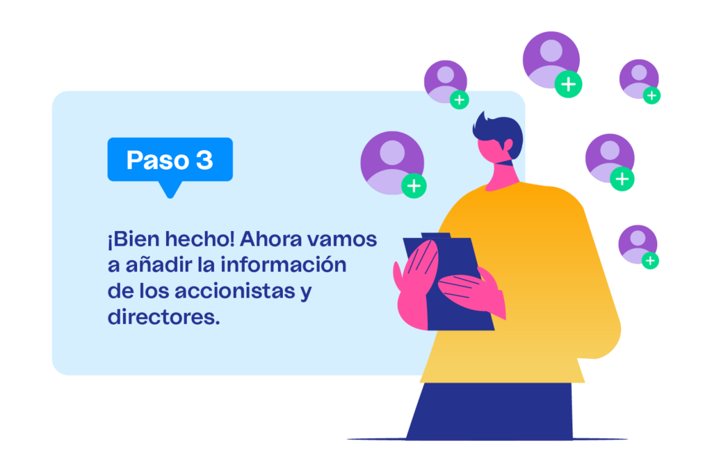 👉🏻A continuación, se te pedirá que agregues información relevante sobre los accionistas y miembros de la junta. Por cada miembro que añadas, tienes que decidir si será accionista, miembro de la junta o ambos. También puedes especificar si esta persona será el representante de la empresa (para temas contables y comerciales).